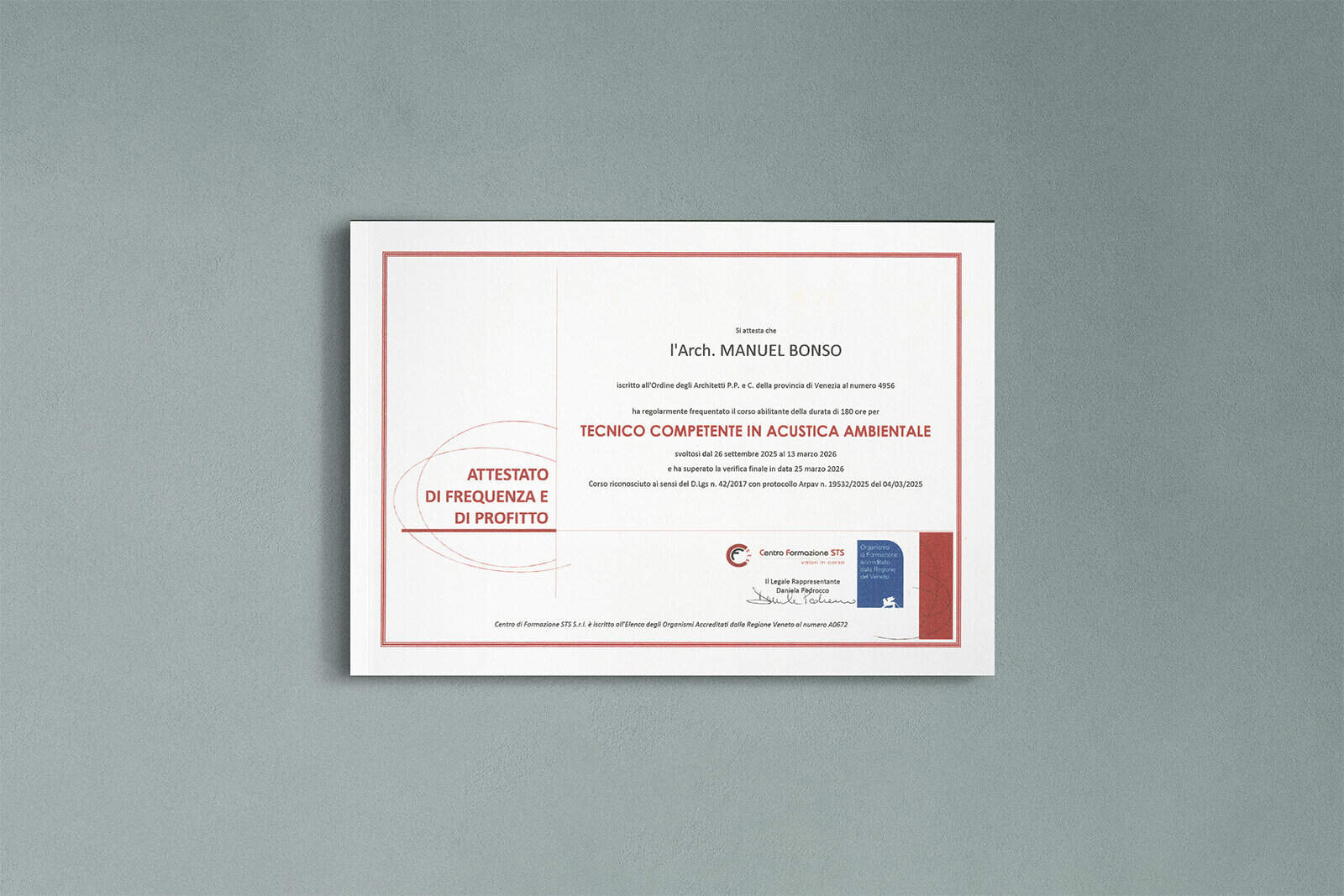 La formazione continua rappresenta oggi un elemento fondamentale per affrontare con competenza le sfide legate alla sostenibilità, alla qualità dell’ambiente costruito e al rispetto delle normative. In questo quadro si inserisce il conseguimento, da parte del nostro architetto Manuel Bonso, della certificazione come Tecnico competente in acustica ambientale, qualifica che attesta un percorso specialistico di alto profilo in un ambito sempre più strategico.